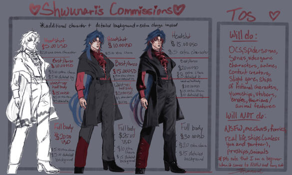 TERMS & CONDITIONS✎ Commissioned art is for PERSONAL USE ONLY. (exceptions for commissioned prints to be commercial use)✎No NFTS or AI art use✎ I have the right to decline commissions.✎ Client must be 18 year or older, or get parent permission to claim a commission spot.✎ Art is only free for special occasions such as giveaways, trades, requests through Strawpage, tips on Twitter, or donations through Ko-Fi.✎ I will refuse service to anyone who is MAGA or voted for Trump. I will also refuse service to Zionists, homophobes, transphobes, xenophobes, and lolicons.✎ I will only draw in my available art styles.✎ I will do up to 3 revisions✎If major revision applied, there will be an extra charge✎ I have the right to post the artwork and/or include it in my portfolio, unless requested otherwise by client.✎ The artwork will be sent via email or another form of submission as a png, jpeg, or pdf file only.✎ The client owns the property and can post the commissioned piece anywhere, as long as it is not resold in any form of purchase and must be credited. (comercial use is the exception but must still be credited)✎ Do not resell or claim my artwork as your own.✎ If the artist cannot complete the commission due to personal reasons, the client will be informed as soon as possible and will receive a full refund.✎ Keep in mind that the artist has diagnosed mental disabilities and can change the availability to draw. Will let you know as soon as possible if there are any delays or complications.DEADLINE